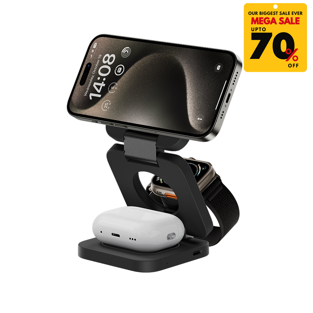 Transformez votre routine avec notre station 3-en-1. Design pliable, charge rapide et magnétisme puissant pour tous vos appareils essentiels.
